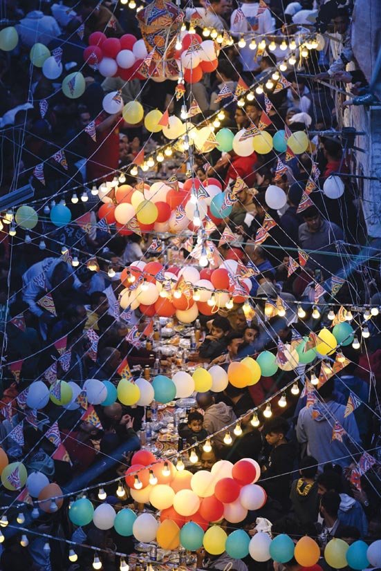 مصريون يزينون شوارعهم ويتجمعون في الشوارع لتناول وجبة «إفطار» جماعية في ضاحية المطرية بالقاهرة، خلال شهر رمضان المبارك. (ا ف ب)
