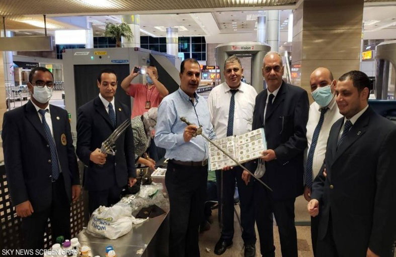 أعلنت السلطات المصرية، إحباط محاولة تهريب قطع آثرية وأسلحة بيضاء وطائرة تجسس وغيرها من الممنوعات، في مطار القاهرة الدولي. وذكرت جمارك مطار القاهرة أن الممنوعات كانت بحوزة مسافر أميركي من أصل مصري، كان عائدا من مدينة سان فرانسيسكو في أميركا عبر مطار فرانكفورت في ألمانيا. وشملت قائمة الممنوعات: 44 قطعة أثرية تنتمي لعصور عدة، منها سيف أثري يعود إلى العصر الأموي، وطائرة تجسس، و7 قطع من الملابس العسكرية، و134 غرام من المخدرات، و17 قطعة سلاح أبيض. وقالت السلطات المصرية إن المسافر أخفى كل هذه الممنوعات داخل حقائبه، في محاولة لتضليل رجال الجمارك والعبور. ومع إخضاع حقائبه للفحص بالأشعة عثرت السلطات هذه الممنوعات الضخمة. وجرى إحالة المسافر إلى النيابة العامة من أجل اتخاذ الإجراءات القانونية في حقه.