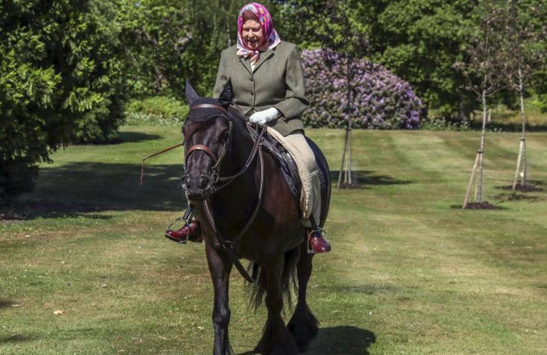 وتعد الملكة إليزابيث من محبي الخيول ومن المولعين بسباقاتها وركوبها، لكنها لم تعد على ما يبدو تمارس هذه الرياضة كما كان سابقا.وارتدت ملكة بريطانيا منديلا ملونا على رأسها مع سترة وقفازات، وذلك للاستمتاع بالطقس المشمس في قلعة وندسور، في ظل الإغلاق المفروض في البلاد.