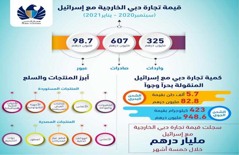بلغ حجم التبادل التجاري بين دبي وإسرائيل خلال الأشهر الخمسة الأخيرة مليار درهم إماراتي، وفق إحصائية حديثة لجمارك دبي كشفت عن حجم قيمة التجارة بين البلدين والتي بلغت 6.217 ألف طن، وزعت بنحو 325 مليون درهم واردات بكمية 718 طنا، و607 مليون درهم صادرات بكمية 5.4 ألف طن، و98.7 مليون درهم “عبور” بكمية 52.4 طن.