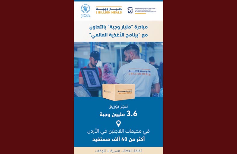 أكملت مبادرة "مليار وجبة"، الحملة الأكبر في المنطقة لتوفير الدعم الغذائي في 50 دولة ضمن أربع قارات، توزيع 3.6 مليون وجبة في مخيمات اللاجئين في الأردن بصيغة قسائم ذكية بالتعاون والتنسيق مع برنامج الأغذية العالمي التابع للأمم المتحدة الذي تولى العمليات اللوجستية للتوزيع.