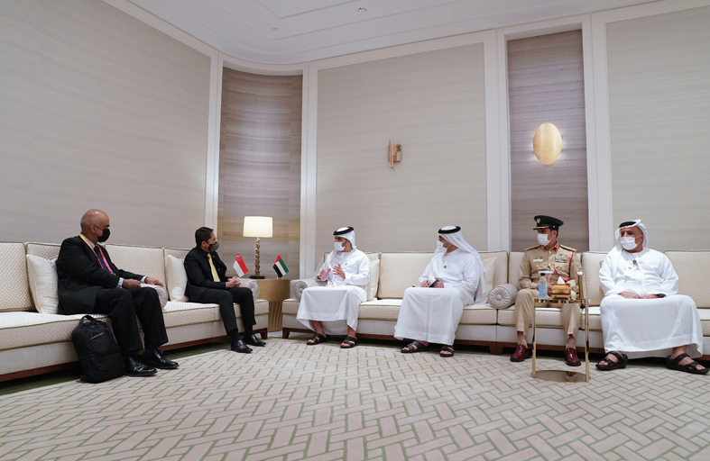 منصور بن محمد يستقبل وزيراً في مكتب رئيس الوزراء السنغافوري ويبحثان تجربة الإمارات في مكافحة كوفيد- 19