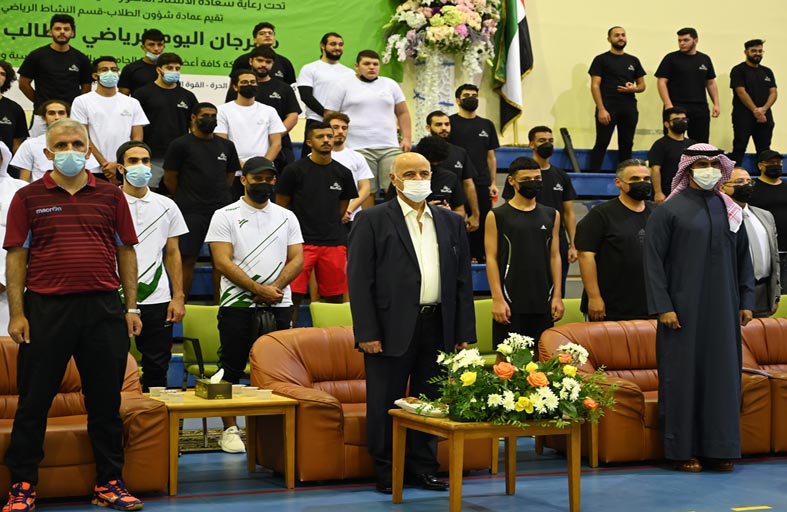 تحت رعاية وحضور سعادة الأستاذ الدكتور حميد مجول النعيمي، مدير جامعة الشارقة، شهدت ملاعب وصالات المجمع الرياضي في جامعة الشارقة فعاليات "مهرجان اليوم الرياضي للطالب الجديد"، والتي تحرص عمادة شؤون الطلاب على تنظيمه سنويا للترحيب بالطلاب الجدد بمشاركة الطلاب القدامى وأعضاء الهيئتين التدريسية والإدارية، بحضور الأستاذ الدكتور عيد كنعان، عميد شؤون الطلاب، والكابتن صلاح طاهر العامري، رئيس قسم النشاط الرياضي بالعمادة، والدكتور هشام عبد الحليم، رئيس قسم إدارة الأنشطة الطلابية بعمادة شؤون الطلاب، والمدربين الرياضيين بعمادة شؤون الطلاب.