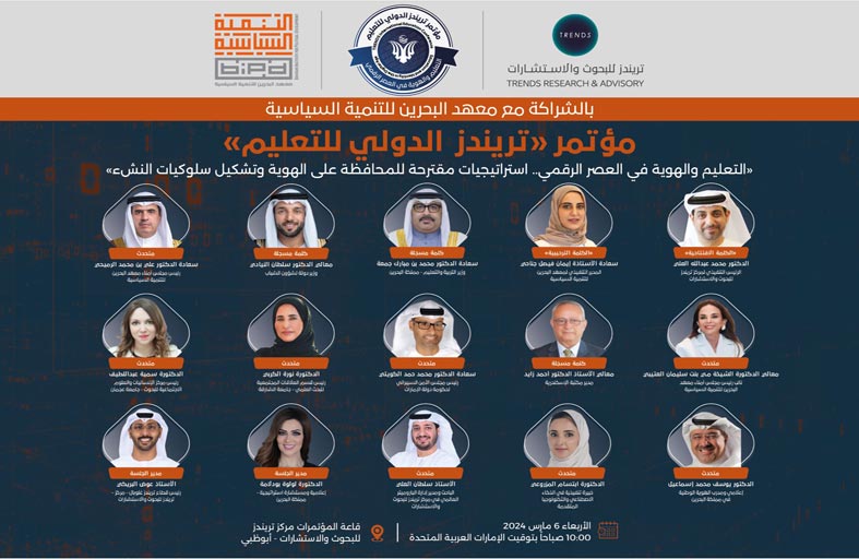 وتواكب النسخة الثانية من المؤتمر، الذي ينظمه «تريندز»، بالشراكة والتعاون مع معهد البحرين للتنمية السياسية، فعاليات الشهر الوطني للقراءة، إذ تستعرض جلساته أهمية التعليم والقراءة في تشكيل الهوية الوطنية للمجتمعات، من خلال جلستين رئيسيتين، تناقش الأولى موضوع «التعليم والهوية في عالم متغير.. تحديات ومخاطر»، وتتمحور الثانية حول «التعليم والهوية في عصر الذكاء الاصطناعي والثورة الرقمية».