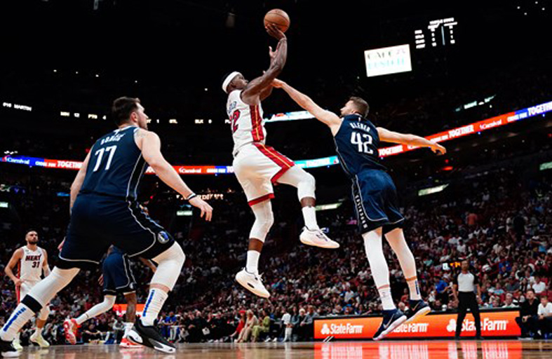 أحرز جيمي باتلر 35 نقطة لينقذ ميامي هيت من خسارة ثالثة توالياً ويحقق فوزاً قاسياً 129-122 على دالاس مافريكس وتتلاشى آمال الأخير في العبور إلى الأدوار الإقصائية (بلاي أوف) من الدوري الأميركي للمحترفين بكرة السلة.
