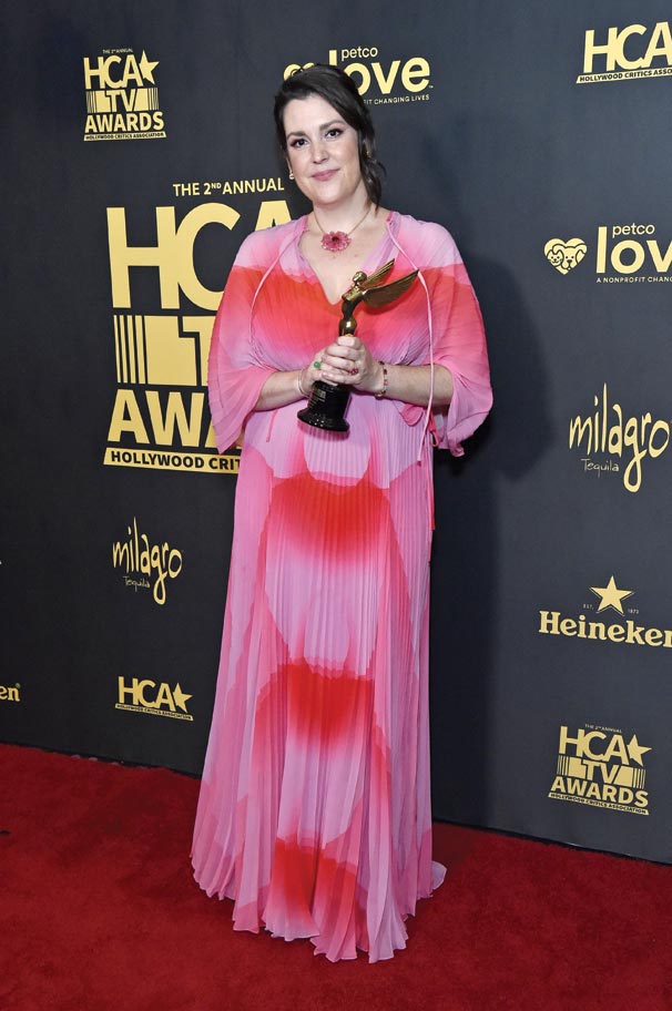ميلاني لينسكي مع جائزتها خلال حفل توزيع جوائز HCA TV السنوي الثاني في بيفرلي هيلز ، كاليفورنيا. (ا ف ب)