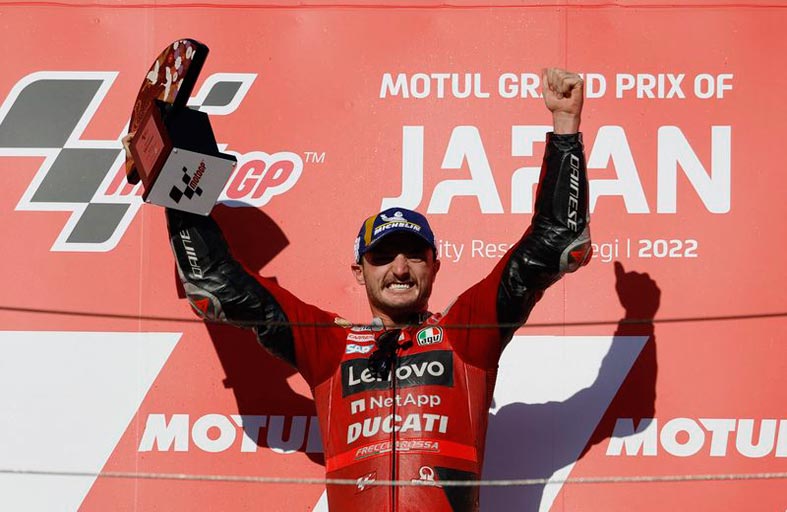 حقق الأسترالي جاك ميلر متسابق فريق دوكاتي أول انتصار له في الموسم الحالي عندما توج بلقب سباق جائزة اليابان الكبرى للدراجات النارية بعد أن قدم أداء متميزا على حلبة موتيجي أمس الأحد بينما عزز الفرنسي فابيو كوارتارارو موقعه في صدارة الترتيب العام للبطولة رغم احتلاله المركز الثامن.