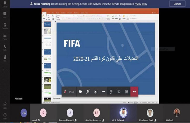 نظمت إدارة الحكام باتحاد الإمارات لكرة القدم يوم الخميس الماضي بنظام الاتصال المرئي “عن بُعد” ورشة عمل فنية لمُقيمي الحكام لعرض ومناقشة التعديلات الجديدة لقانون كرة القدم 2020-2021 ، وذلك بحضور علي حمد البدواوي عضو مجلس إدارة اتحاد الكرة رئيس لجنة الحكام ، وصالح المرزوقي عضو لجنة الحكام و وخالد الدوخي المدير الفني للحكام وأحمد يعقوب المسؤول الفني للمقيمين والمحاضرين ، عبدالواحد خاطر ، سلطان ساحوه إلى جانب 29 مقيماً .