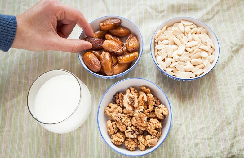 - تناول الأطعمة التي تحتوي على نسبة عالية من الماء، بما في ذلك البطيخ والخيار والكوسا واللبن والمرق والمكسرات والبذور والتمر.