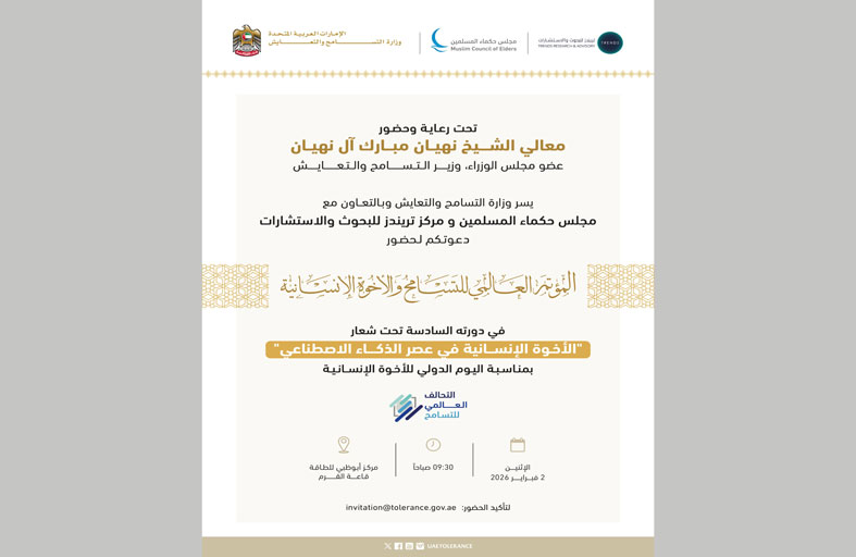 وتنظم المؤتمر وزارة التسامح والتعايش بالتعاون مع مجلس حكماء المسلمين ومركز تريندز للبحوث والاستشارات، ليكون منصة دولية مفتوحة للحوار العميق والمسؤول، تجمع قادة الفكر والدين وصنّاع القرار والأكاديميين والخبراء حول العالم، لبحث مستقبل القيم الإنسانية المشتركة في عصر الذكاء الاصطناعي، وتعزيز مكانة الأخوّة الإنسانية بوصفها إطاراً أخلاقياً موجّهاً للتقدّم التكنولوجي.