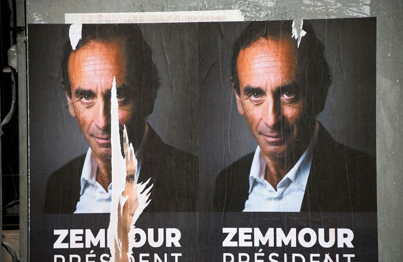 من جانبه، يظل منحنى ماكرون مستقيمًا عمليًا طوال الفترة بأكملها، مما يؤكد أن استقطاب جزء من ناخبيه من قبل المجادل الراديكالي، إن وُجد، هامشي للغاية. كما يظهر أن بروز زمور، يسلط الضوء على منافسة داخل اليمين المتطرف وجزء من اليمين الجمهوري في طريقه الى الراديكالية السياسية. علاوة على ذلك، يمكن ملاحظة هذا العامل الأخير على شبكة تويتر. و في الوقت الحالي، فإن التقدم، ثم الحفاظ على مستوى عالٍ من المنافسة للوبان، يمنع كزافييه برتران من تأكيد ذاته بوضوح ضد منافسيه على اليمين، فاليري بيكريس وميشيل بارنييه... على الأقل في استطلاعات الرأي.