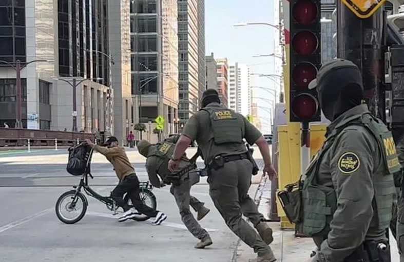 وفي الفيديو يظهر قرابة عشرة عناصر من وكالة الهجرة والجمارك يرتدون زياً كاملًا، وهم يطاردون رجلًا على دراجة هوائية في شوارع شيكاغو المزدحمة، وخلال المطاردة، كان العامل يردد بصوت مرتفع "لستُ مواطناً أمريكياً"، و"هيا تعالوا"، دون أن يبدي أي سلوك جسدي أو تهديد مباشر تجاه العناصر، وفقاً لشهود عيان.