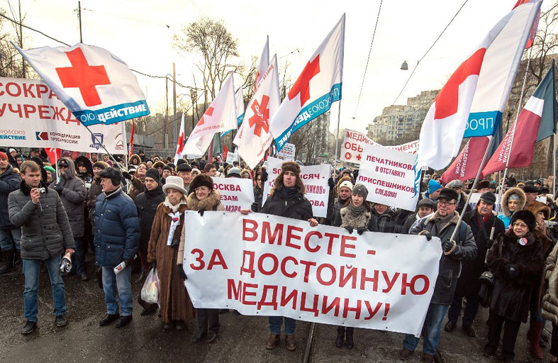 تم إعادة تركيز الرعاية الصحية على المستشفيات الكبيرة، ولكن دون تزويدها بالمعدات اللازمة، ودون منح أجور مقبولة للأطباء الذين يضطرون، في غالب الأحيان، إلى الجمع بين عدة وظائف لتغطية نفقاتهم. وقد تمت استقالات جماعية لفرق طبية تناولتها بكثافة وسائل الإعلام، وأصبحت بعض المناطق الروسية صحاري طبية، كما تبرز ذلك تقارير مستقلة حول الحصول على الرعاية الصحية في روسيا.