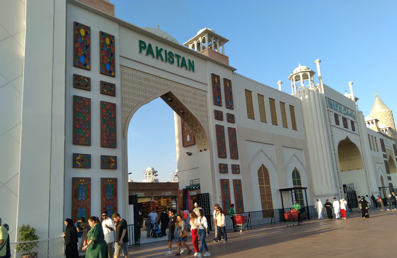 تم تصميم واجهة جناح الباكستان لترمز إلى أحد المباني الباكستانية القديمة التراثية ألا وهو حصن شاهي في لاهور, ولتجسد الواجهة لضيوف القرية العالمية هذا الرمز الذي يعتبر من المباني النراثية, كما أن الجناح الباكستاني في معرض إكسبو شانغهاي في الصين عام 2010 قد صمم على هيئة حصن لاهور ويقع في مدينة لاهور البنجاب بباكستان يقع في الزاوية الشمالية الغربية لمدينة لاهور المسورة وهو عبارة عن بناء شبه منحرف بني على مساحة 20 هكتار, وتعود أصول الحصن إلى العصور القديمة لكن الهيكل الأساسي للحصن كان قد بني في عهد سلطنة مغول الهند تحديداً في عهد الإمبراطور جلال الدين أكبر, ثم تطوّر البناء باستمرار بواسطة عدد من أباطرة المغول وأباطرة السيخ والحكام الإنجليز, و له بوابتان تُعرف إحداهما باسم بوابة ألمغيري بناها الإمبراطور أورنكزيب وهو عالم كبير وتفتح هذه البوابة باتجاه مسجد بادشاهي, والبوابة الأخرى أقدم وتعرف باسم بوابة ماستي أي مسجدي باللغة البنجابية أو بوابة مسجدي, ويُظهر الحصن تقاليد العمارة المغولية الغنية, واستخدمت بوابة ألمغيري حالياً كبوابة رئيسية بعد أن أغلقت بوابة ماستي بشكل دائم ويُظهر الحصن تقاليد العمارة المغولية الغنية, ومن المواقع الشهيرة التي يتضمنها الحصن شيش محل لاهورو بوابة ألمغيري ومسجد موتي, وفي عام 1981م أدرجت منظمة اليونسكو حصن لاهور كموقع تراث عالمي مع حدائق شاليمار لكنه أدرج في قائمة مواقع التراث العالمي المعرضة للخطر بدءاً من عام 2000 ولا زال حتى الآن.