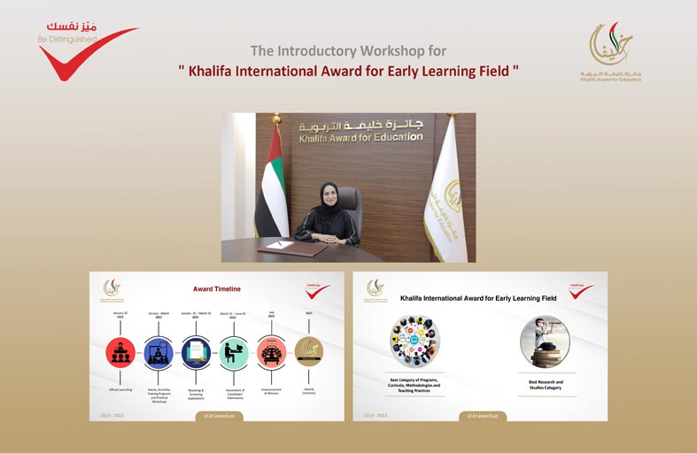 نظمت الأمانة العامة لجائزة خليفة التربوية ورشة عمل تعريفية لمجال جائزة خليفة العالمية للتعليم المبكر عرضت خلالها أهداف هذا المجال ودوره في دعم مسيرة النهوض بالطفولة والتعليم المبكر من خلال طرحه على المستوى العالمي بفئتيه في البحوث والدراسات، والبرامج والمناهج والمنهجيات وطرق التدريس . وقدمت الورشة عن بعد فاطمة البستكي عضو اللجنة المانحة لمجال جائزة خليفة العالمية للتعليم المبكر ، بحضور عدد من القيادات التعليمية والتربوية.