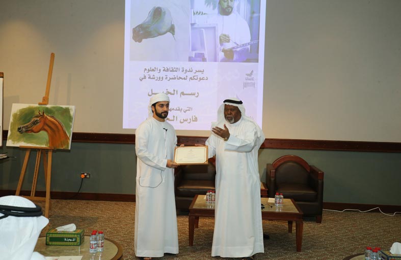 نظمت لجنة الشباب في ندوة الثقافة والعلوم ورشة فنية للفنان فارس الحمادي في “رسم الخيل” بحضور بلال البدور رئيس مجلس الإدارة وعلي الشريف رئيس لجنة الشباب والشاعر محمود نور وشارك في الورشة مجموعة من الشباب والمهتمين.