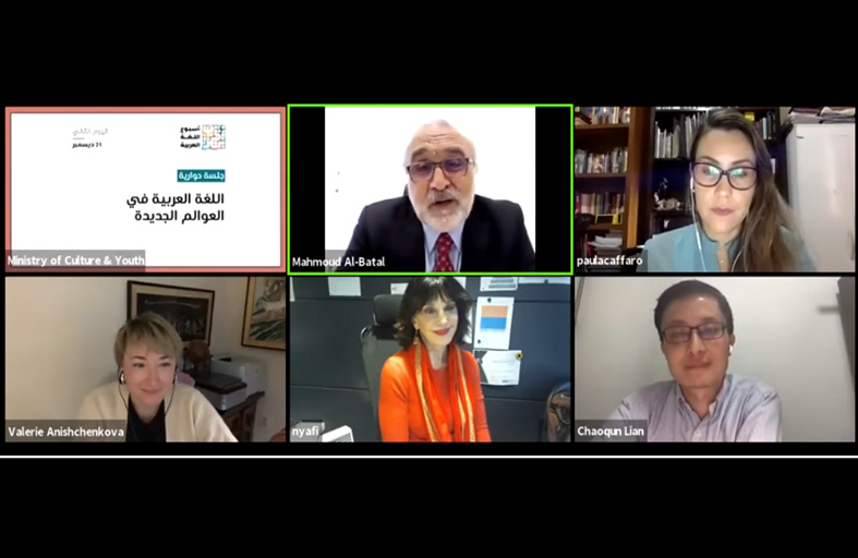 ضمن فعاليات أسبوع اللغة العربية وبالتزامن مع إطلاق وزارة الثقافة والشباب تقرير حالة اللغة العربية، انعقدت الندوة الحوارية بعنوان "اللغة العربية في العوالم الجديدة" بمشاركة كل من الدكتورة فاليري أنيشينكوفا من جامعة ميريلاند بالولايات المتحدة، والدكتور شاوكون ليان من جامعة بكين الصينية، والدكتورة باولا كافارو من جامعة ساو باولو في البرازيل، والأستاذة ندى يافي من معهد العالم العربي في باريس بفرنسا، وأدارها الدكتور محمود البطل، أستاذ اللغة العربية في الجامعة الأمريكية ببيروت.