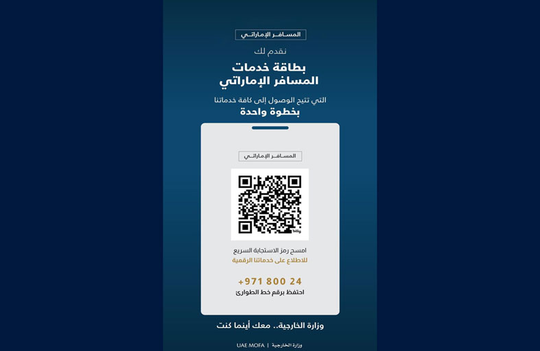 أطلقت وزارة الخارجية بطاقة خدمات المسافر الإماراتي؛ التي توفر باقة متكاملة من الخدمات بخطوة واحدة؛ حيث تأتي هذه المبادرة تماشيًا مع سياسات الوزارة وخططها الإستراتيجية التي تضع مواطني الدولة في مقدمة أولوياتها، لا سيما أثناء وجودهم خارج الدولة، وذلك من خلال منظومة مؤسسية متكاملة تتسم بالجاهزية والكفاءة التشغيلية العالية، والإجراءات الفعّالة التي تترجم إلى تنسيق مستمر بين فرق العمل في الوزارة والبعثات التمثيلية للدولة في الخارج، بما يضمن تقديم الدعم والرعاية الدائمين، والاستجابة السريعة في حالات الطوارئ.