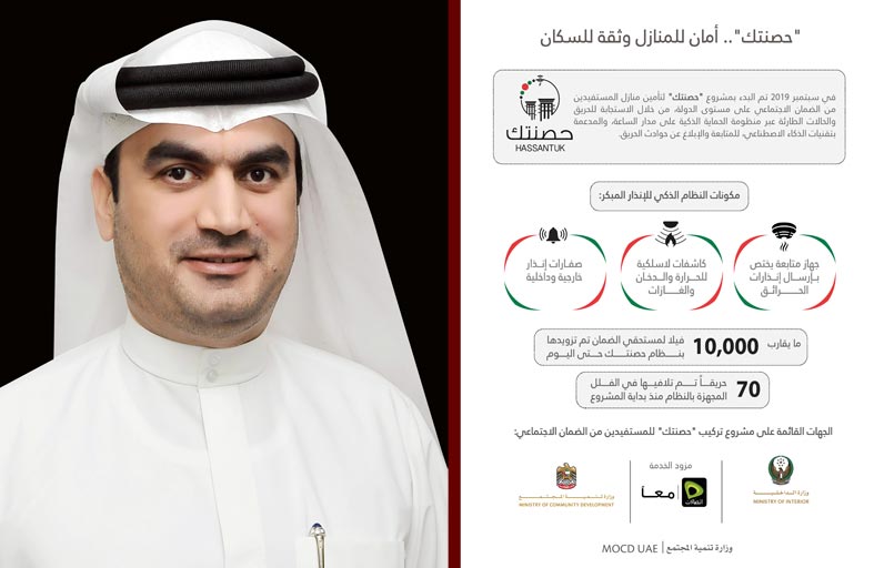 ومن جهته صرح العميد محمد عبد الله النعيمي رئيس اللجنة التنفيذية لنظام "حصنتك" الذكي للإنذار المبكر بوزارة الداخلية" أننا حريصون على تعزيز شراكاتنا بما يعزز الوقاية والسلامة المجتمعية ونعمل بهذا التعاون مع "وزارة تنمية المجتمع" لتزويد المستفيدين من الضمان الاجتماعي بنظام حصنتك الذكي للإنذار المبكر من الحريق مجانا بما يسهم في ضمان الاستجابة السريعة لإنذارات الحريق وتأمين أقصى معايير الحماية من المخاطر. وتأتي هذه المبادرة دعما للرؤية الاستراتيجية لوزارة الداخلية وتهدف إلى رفع سُبل الحماية والأمن بما يتماشى مع رؤية الإمارات 2021 بأن تكون الدولة البقعة الأكثر أمانا على المستوى العالمي".