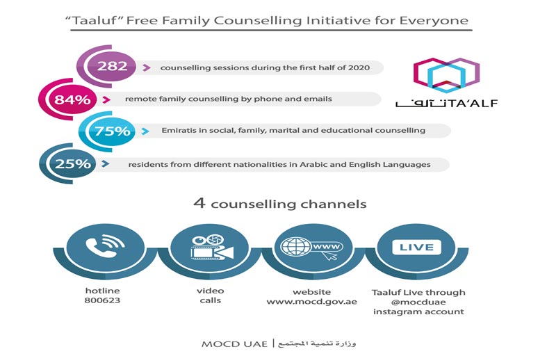 تواصل وزارة تنمية المجتمع تقديم خدمة "تآلف" للاستشارات الأسرية المجانية "عن بعد" عبر الاتصال الهاتفي ومن خلال البريد الإلكتروني إضافة إلى حلقات "تآلف لايف" التي يجري بثها أسبوعيا عبر انستغرام الوزارة لتقديم الإرشاد الأسري والخدمات الاستشارية المجانية "عن بعد" لجميع أفراد المجتمع من المواطنين والمقيمين في مختلف المجالات التي تعزز استقرار الأسرة وتلاحم المجتمع.