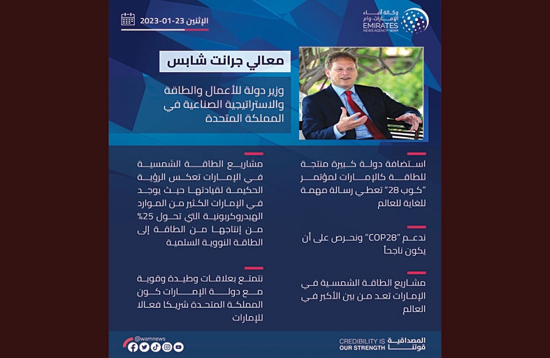 رحب معالي جرانت شابس وزير دولة للأعمال والطاقة والاستراتيجية الصناعية في المملكة المتحدة باستضافة دولة الإمارات للنسخة المقبلة من مؤتمر الأطراف في اتفاقية الأمم المتحدة الإطارية لتغير المناخ “كوب 28” .. معتبرا أن استضافة دولة كبيرة منتجة للطاقة كالإمارات للمؤتمر تعطي رسالة مهمة للغاية للعالم . وقال معاليه - في لقاء على هامش حضوره أسبوع أبوظبي للاستدامة - إن مثل هذه الأحداث والمناقشات توضح رؤية قيادة دولة الإمارات المستقبلية تجاه الاستدامة كونها حجر الأساس في بناء المستقبل .. لافتا إلى أن أسبوع أبوظبي للاستدامة يعد منصة عالمية تجسد حرص الإمارات على استقطاب قادة المجتمع الدولي للعمل معاً بما يخدم مصالح الشعوب وتطلعاتها في مجال التنمية الاقتصادية والاجتماعية المستدامة .