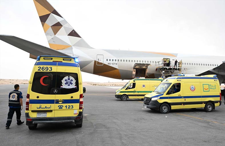 وفور وصول طائرة الاتحاد للطيران والقادمة من العريش إلى مطار زايد الدولي، قامت الفرق الطبية المتواجدة على أرض المطار بعملية نقل الجرحى والمصابين التي تستدعي حالاتهم نقلهم بشكل فوري إلى المستشفيات لتلقي الرعاية الصحية.