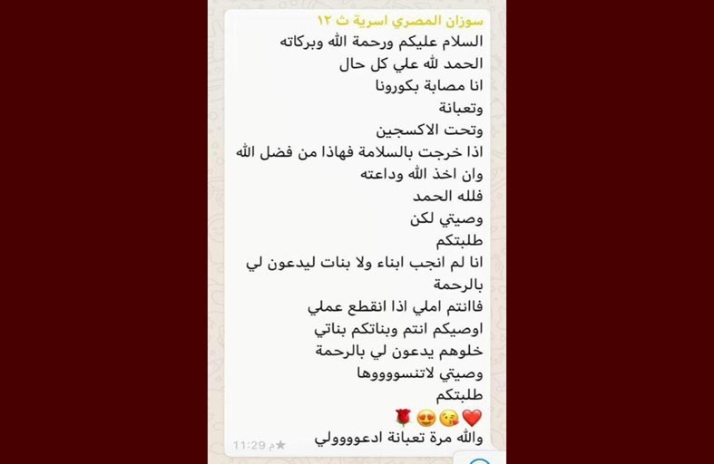 وجاء في رسالة المعلمة بعد ثبوت إصابتها بفيروس كورونا: "السلام عليكم ورحمة الله وبركاته، الحمد لله على كل حال، أنا مصابة بكورونا وتعبانة وتحت الأكسجين، إذا خرجت فهذا من فضل ربي، وإن أخذ الله وداعته فلله الحمد، وصيتي لكم، أنا لم أنجب أبناء ولا بنات ليدعوا لي بالرحمة، فأنتم أملي بعد انقطاع عملي، أوصيكم أنتم وبناتكم بناتي خلوهم يدعوا لي بالرحمة وصيتي لا تنسوها طلبتكم والله إنني تعبانة مرة".