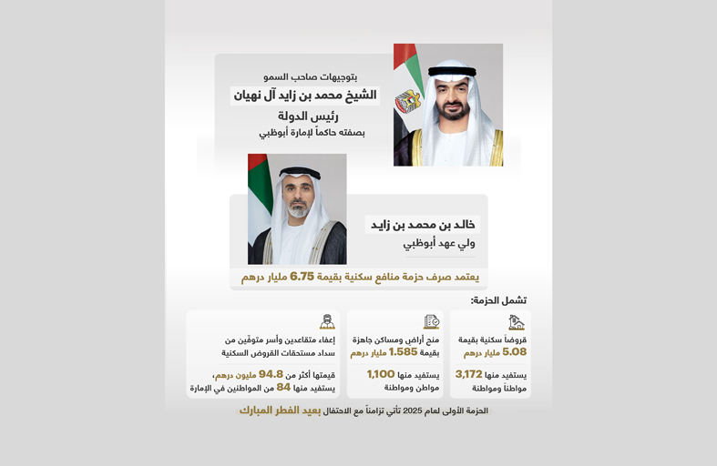 بتوجيهات صاحب السمو الشيخ محمد بن زايد آل نهيان رئيس الدولة "حفظه الله"، بصفته حاكماً لإمارة أبوظبي، اعتمد سمو الشيخ خالد بن محمد بن زايد آل نهيان ولي عهد أبوظبي رئيس المجلس التنفيذي لإمارة أبوظبي، صرف حزمة منافع سكنية للمواطنين في إمارة أبوظبي، بقيمة إجمالية بلغت 6,75 مليار درهم، استفاد منها 4,356 مواطناً ومواطنة على مستوى الإمارة.