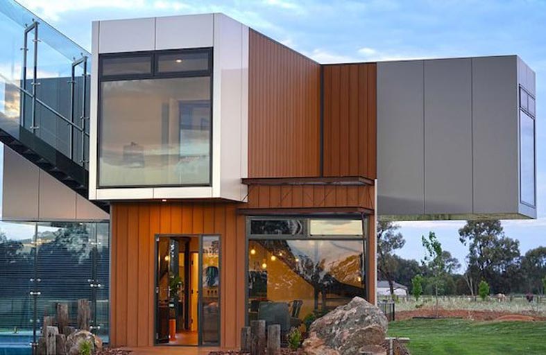 نجح الزوجان الأستراليان جيمس سرائيل بريغز، في بناء منزل فاخر بالكامل من سبع حاويات ضخمة للشحن، بتصميم مميز وعصري، بالقرب من منطقة كيالا شمال مقاطعة فيكتوريا. وقد تم ترشيح التصميم الفريد للمنزل، الذي وصلت تكلفة بنائه إلى 750 ألف دولار أمريكي، للفوز بلقب أفضل تصميم معماري للعام في حفل توزيع جوائز البناء الأسترالية في عام 2019. يتألف المنزل من طابقين مع العديد من مناطق المعيشة المضاءة بنور الشمس وثلاث غرف نوم، إلى جانب حاويات منفصلة ستكون بمثابة مساحات قائمة بذاتها لتستمتع بها الأسرة عندما يكبر الأطفال. يوفر الجناح الرئيسي المنفصل للمنزل والذي يعتبره الزوج جيمس الجزء المفضل لديه، مساحة مثالية للضيوف في عطلة نهاية الأسبوع. يمكن الوصول إلى الجناح الرئيسي، المرتفع على أربعة أعمدة ضيقة، من خلال ممر زجاجي مغلق يؤدي أيضًا إلى منطقة ترفيهية على السطح مع مناظر رائعة للطبيعة المحيطة.
