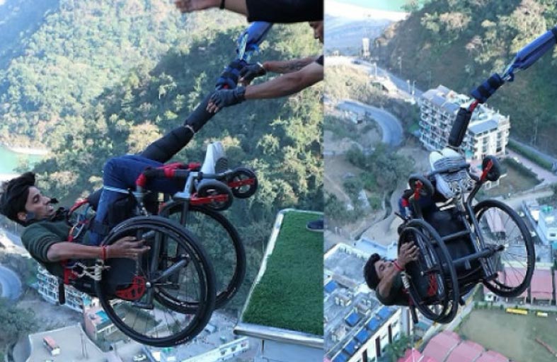 يُعد القفز بالحبال احدى أكثر الأنشطة الشعبية بين محبّي المغامرة في الهند، من بينهم ثلاثيني مقعد، مارس هوايته المفضلة على كرسيه المتحرك، وتسلق أعلى أحد مراكز القفز، وحقق رغبته بـ "قفزة بنجي" من ارتفاع 117 متراً. في بداية الفيديو، الذي حظي بانتشار واسع، يُثبّت آبهَي دوغرا جيداً على كرسيه المتحرك بواسطة حزام الأمان. بعد ذلك، دفع الطاقم بكرسي متحرك بلطف من الرافعة، ما أدى إلى هبوطه سقوطاً حرّاً يحبس الأنفاس. وفي اللقطة الأخيرة، ارتسمت علامات الفرح على وجهه، تعبيراً عن فخره بإنجازه.