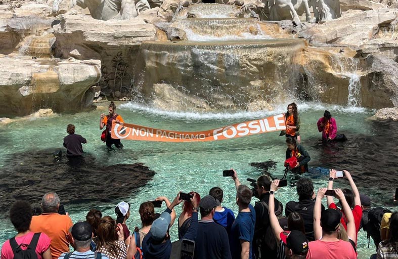 تسلق سبعة شبان من نشطاء الجيل الأخير لمكافحة تغير المناخ نافورة تريفي في روما يوم الأحد، وسكبوا محلولاً للفحم المخفف في مياهها لتتحول إلى اللون الأسود.