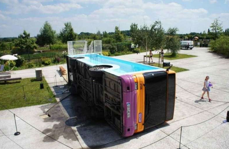 ليست هذه حافلة منقلبة على جانب الطريق بعد تعرضها لحادث، بل هي مشروع فريد أطلقه فنان فرنسي، عبر تحويل حافلة قديمة إلى مسبح كبير يتسع للعديد من الأشخاص.