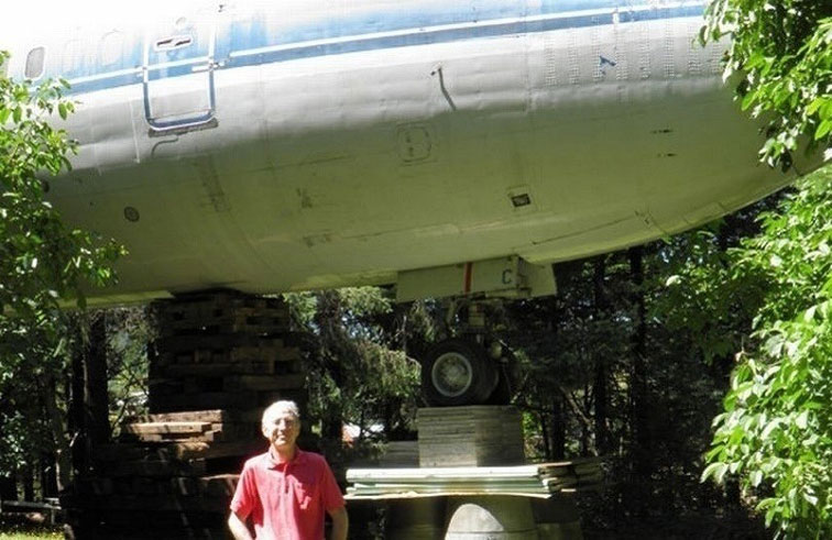 وقرر المهندس السابق بروس كامبل أولاً أنه يريد العيش في طائرة مهجورة في سن الـ 15. ولإحياء حلمه القديم، دفع الرجل البالغ من العمر 73 عاماً ما يقرب من 26000 دولار مقابل 10 أفدنة من الأرض في الغابة في ولاية أوريغون بالولايات المتحدة. واحتاج بروس بعد ذلك إلى العثور على طائرته عندما قال إنه ارتكب خطأ فادحاً بشرائها من ساحة خردة مقابل 100 ألف دولار. وقال كامبل عن الخطأ الذي ارتكبه "لن أفعل ذلك مرة أخرى. أوصي بشدة بشراء طائرة نفاثة سليمة تماماً وتعمل بكامل طاقتها، باستثناء ربما إزالة المحركات". ويمكن أن تتسع الطائرة في الأصل لـ 200 شخص وتبلغ مساحتها 1066 قدماً مربعة. ولها تاريخ مثير للاهتمام، حيث نقلت رفات مالك شركة الطيران، الذي كان متزوجاً من السيدة الأولى السابقة جاكلين كينيدي أوناسيس، في وقت وفاته.