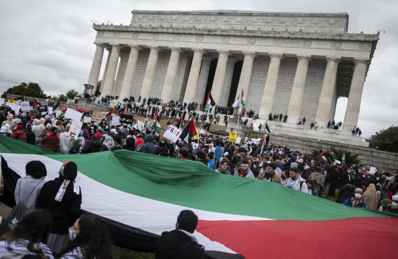 وتجمّع المشاركون أمام نصب لنكولن التذكاريّ، وهو مكان رمزي للاحتجاج في العاصمة الأميركيّة، مردّدين شعارات تعبّر عن رغبتهم في رؤية “فلسطين حرّة” ومطالبين بإنهاء ما يعتبرونه “فصلاً عنصريّاً” من جانب إسرائيل بحقّ الشعب الفلسطيني.