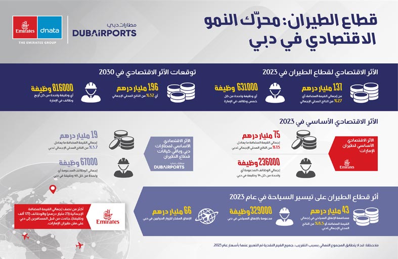 ويقدّر دعم قطاع الطيران في دبي، والذي يتألف من مجموعة الإمارات ومطارات دبي “مطار دبي الدولي ومطار دبي ورلد سنترال - آل مكتوم الدولي” وغيرها من الكيانات، في اقتصاد إمارة دبي خلال عام 2023، بما قيمته 137 مليار درهم أي 37.3 مليار دولار أمريكي من إجمالي القيمة المضافة، أي ما يعادل 27% من الناتج المحلي الإجمالي لدبي.