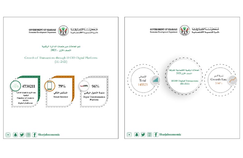 انجزت دائرة التنمية الاقتصادية بالشارقة 145523 معاملة رقمية خلال النصف الأول من العام 2021 محققة نمواً بنسبة 104 بالمائة من حيث إجمالي عدد المعاملات المنجزة مقارنة بعام 2020.