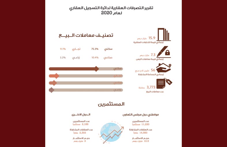 وبين الشامسي أن المشاريع العقارية المتميزة التي تم طرحها خلال عام 2020 ساهمت في تنشيط حركة التداولات العقارية وتنشيط معاملات رغم آثار الجائحة، حيث تم طرح مشاريع متنوعة ذات استخدامات متعددة تراوحت بين التجارية والصناعية، ودعا الشامسي شركات التطوير العقاري إلى دراسة السوق العقاري والتعرف على حاجات المستثمرين لتصميم منتجات عقارية مناسبة ومنافسة وتحقق الفائدة لكلا الطرفين. وأشار الشامسي إلى أن “قرار تخفيض رسوم المشترين لغير مواطني مجلس التعاون الخليجي من 4% إلى 2% من قيمة البيع، قد أدى إلى ارتفاع في عدد معاملات البيع عند المستثمرين العرب بشكل ملحوظ بنسبة نمو وصلت إلى32.5% بعد بدء تطبيقه في السنة الماضية، وهو ما أسهم في تعزيز ودعم اقتصاد الإمارة الباسمة، وجذب الاستثمارات الأجنبية المباشرة للقطاع العقاري».