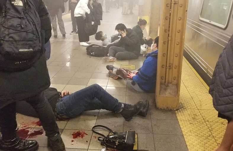 أصيب ما لا يقل عن 16 شخصًا بإطلاق نار وبعضهم بشظايا على يد مسلح مجهول يرتدي سترة عاكسة وقناع واقي من الغازات في محطة مترو الأنفاق المتجه شمالا في ضاحية بروكلين بمدينة نيويورك.