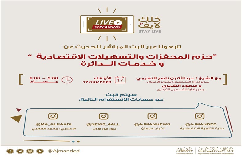 و اكد الشمري على التعاون مع شركاء اقتصادية عجمان كدائرة البلدية والتخطيط وغرفة تجارة وصناعة عجمان في إطلاق تسهيلات إضافية للتخفيف على تلك القطاعات من الآثار الاقتصادية الناجمة عن الظروف الحالية ، وتمكينها من تجاوزالمرحلة الراهنة. و تُنظّم دائرة التنمية الاقتصادية في عجمان بث حي ومباشر عبر برنامجها “خلّك لايف” اليوم من خلال موقع التواصل الاجتماعي”الإنستغرام” على حساب الدائرة @AJMANDED وعلى حساب الشبكات الإخبارية @AJMANNEWS و@NEWS_4ALL من الساعة الخامسة وحتى السادسة مساءً للحديث مع مجتمع الأعمال عن حزم المحفّزات والتسهيلات الاقتصادية التي أعلنت عنها حكومة عجمان.