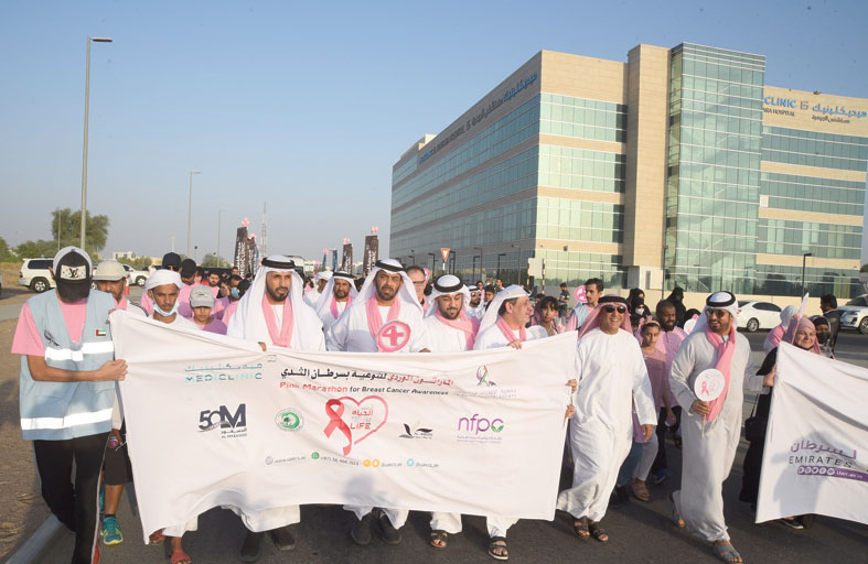 شهدت مدينة العين بالتزامن مع الشهر العالمي للتوعية بسرطان الثدي، مسيرة حاشدة نظمتها جمعية الإمارات للسرطان، بالتعاون مع "ميديكلينيك" مستشفى الجوهرة حملت عنواناً "المشي الوردي للتوعية بسرطان الثدي، شارك فيها الشيخ الدكتور سالم محمد بن ركاض رئيس مجلس إدارة الجمعية، والدكتور المحامي عبدالله الكعبي نائب الرئيس، والدكتور ابراهيم علي رئيس جمعية أصدقاء البيئة، وعدد من المسؤولين والأطباء وممثلين من الجمعيات الصحية والخيرية والإنسانية، والسيدات والطالبات ومشاهير التواصل الاجتماعي وفريق متطوعي الجمعية بقيادة صالح خاطر. وجابت المسيرة منطقة الخبيصي بجوار مركز العين للمؤتمرات والاحتفالات، بحضور أكثر من 400 مشارك من مختلف الأعمار، رافعين شعار " نمشي لأجلك"، تبعها احتفال أمام مستشفى الجوهرة تضمن كلمات ونشاطات ترفيهية وفقرات رياضية وأنشطة صحية وتثقيفية ومسابقات، إضافة إلى تكريم الأمهات والنساء الناجيات من سرطان الثدي، وتسليم شهادات التقدير والدروع على الجهات والرعاة.